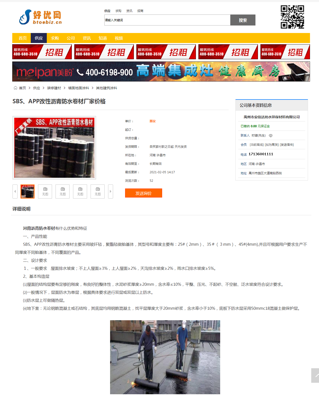 禹州市安信達防水環(huán)保材料有限公司是集科研、生產、設計、施工為一體的專業(yè)化防水企業(yè),擁有全自動生產線,主要生產SBS彈性體改性瀝青防水卷材、自粘高聚物防水卷材、高分子復合防水卷材、多彩瀝青瓦、聚乙烯丙綸滌綸防水卷材、合成高分子防水涂料等新型研發(fā)產品。優(yōu)鐵建是公司旗下品牌,以其強勁的發(fā)展勢頭,獨樹一幟,立志打造*強防水品牌。