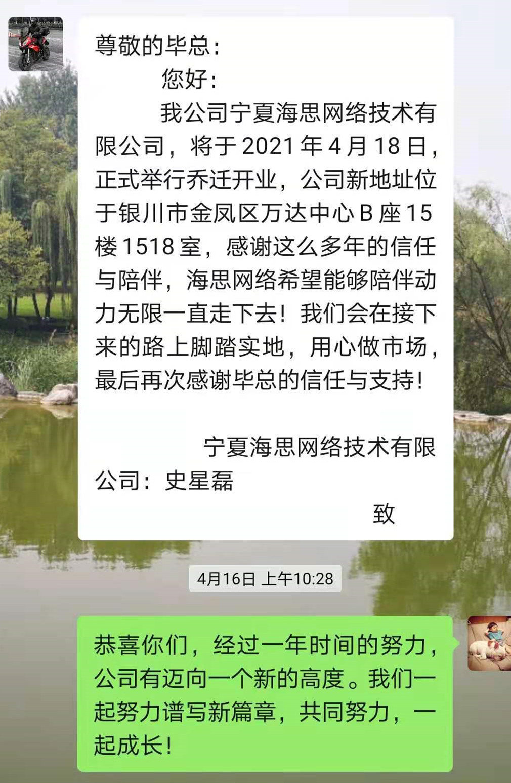 寧夏海思網(wǎng)絡(luò)史總表示:感謝畢總多年的信任、陪伴與支持,海思網(wǎng)絡(luò)希望能夠陪伴萬家燈火一起走下去!我們會(huì)在接下來的路上腳踏實(shí)地,用心做市場(chǎng)!