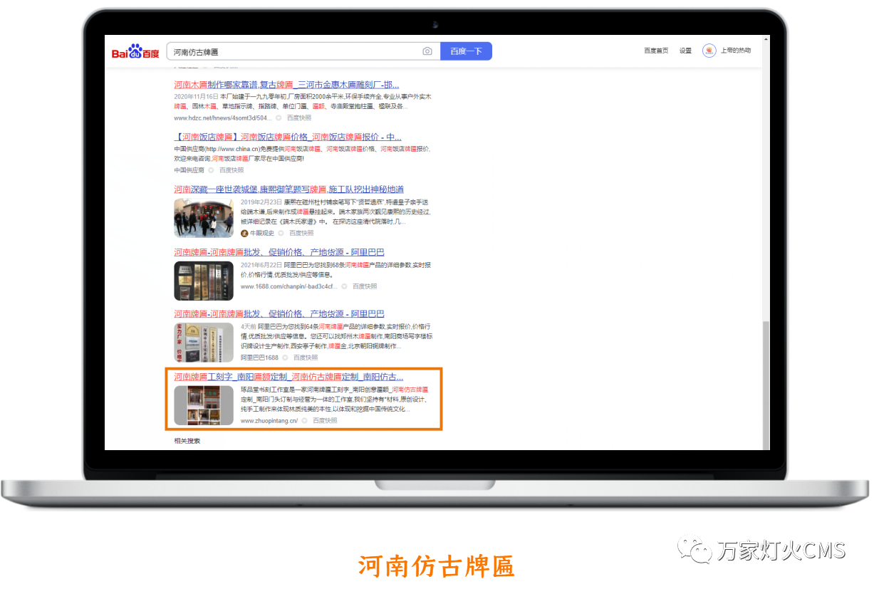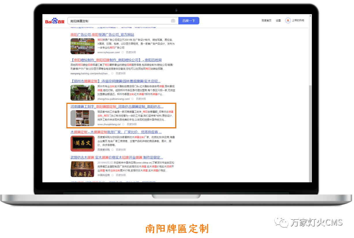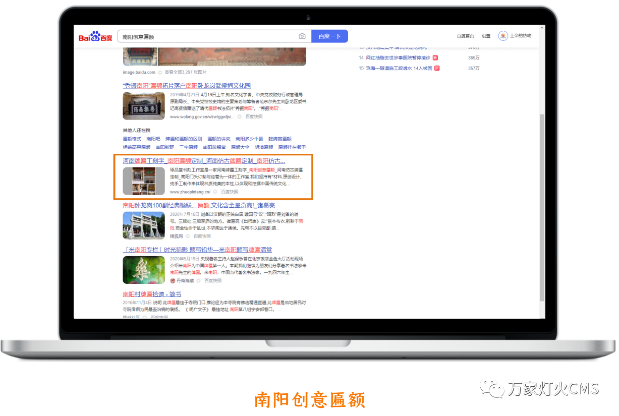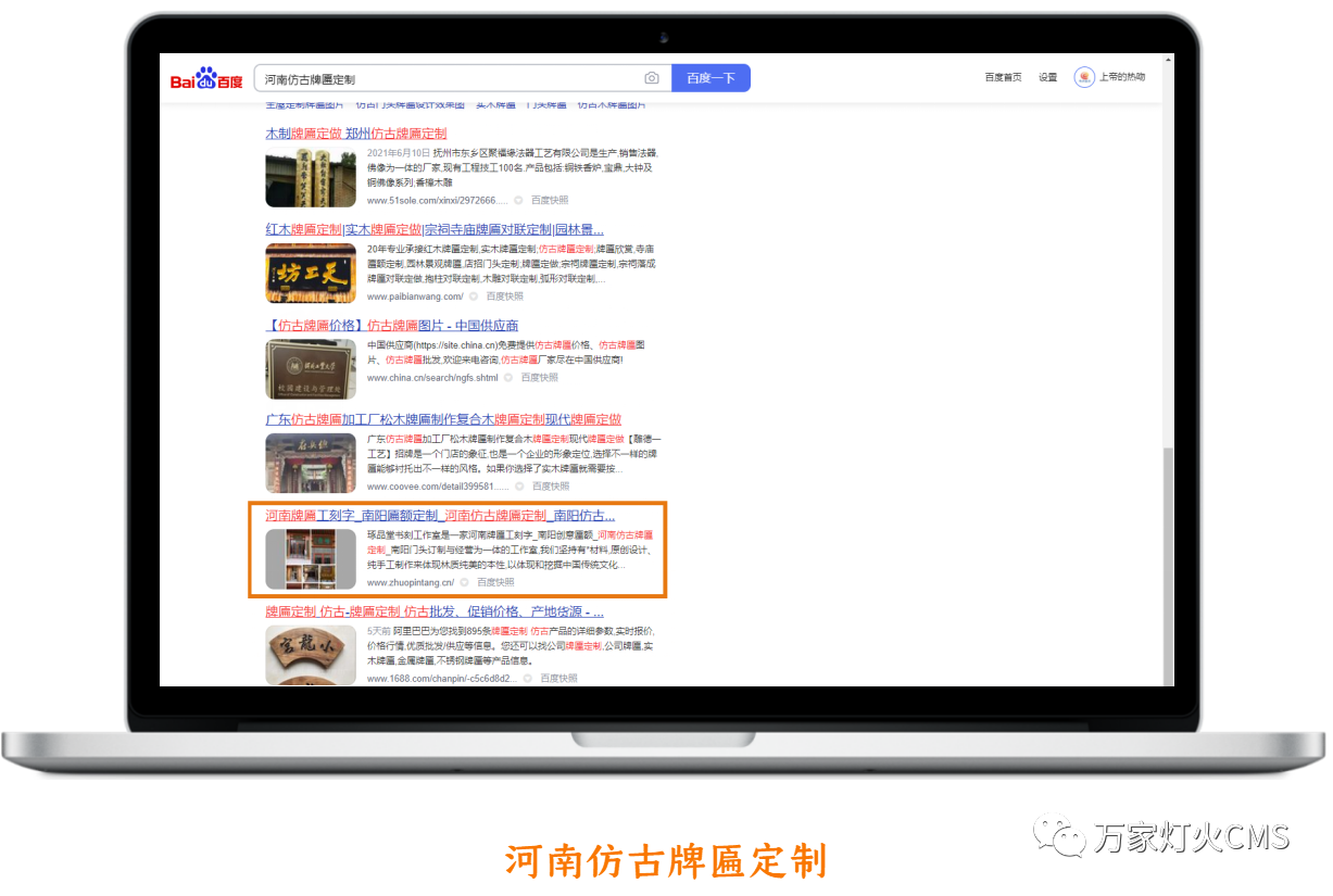 出乎宋總意料之外的是:網(wǎng)站上線兩周,就被百度收錄,且關(guān)鍵詞:河南仿古牌匾、河南仿古牌匾定制、河南門頭牌匾刻字、南陽(yáng)創(chuàng)意匾額、南陽(yáng)牌匾定制等關(guān)鍵詞均在百度首頁(yè)排名。