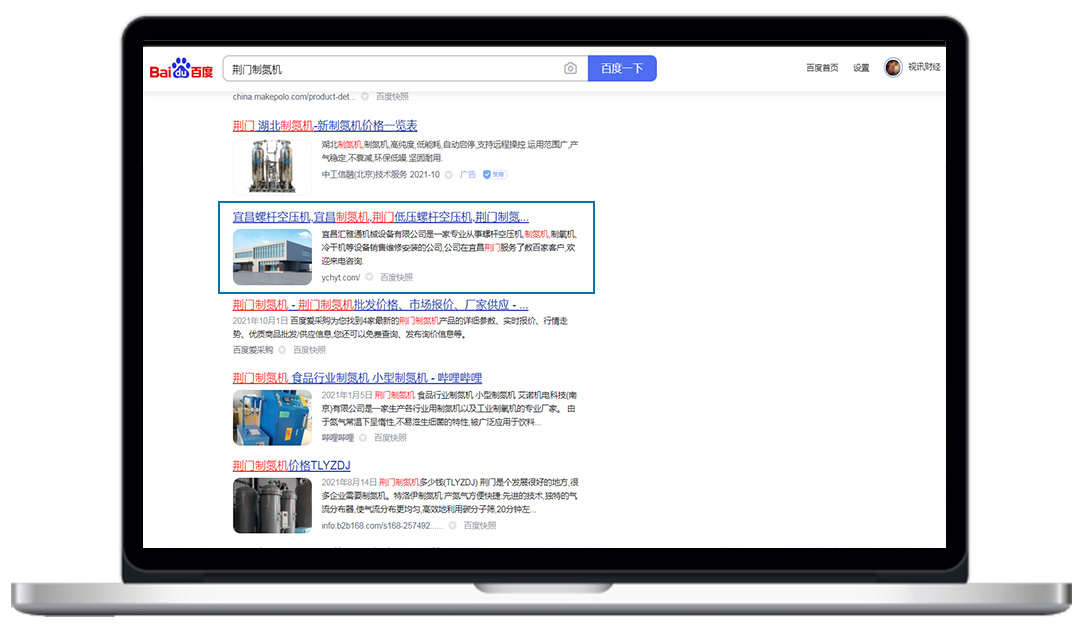 匯雅通官網(wǎng)上線不到1個(gè)月,成功被搜索引擎收錄,而且關(guān)鍵詞:荊門制氮機(jī)、宜昌螺桿空壓機(jī)、宜昌干燥機(jī),均在百度首頁展示。