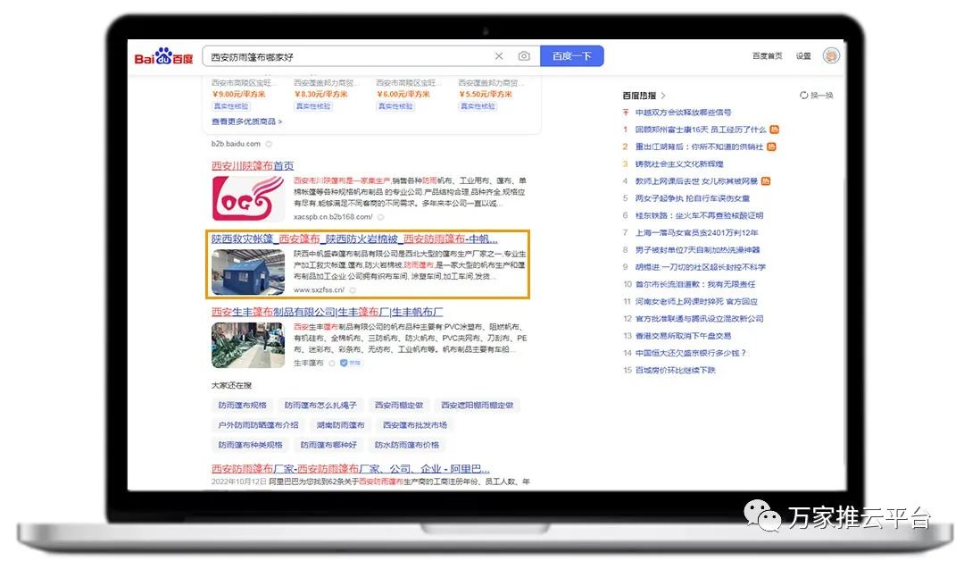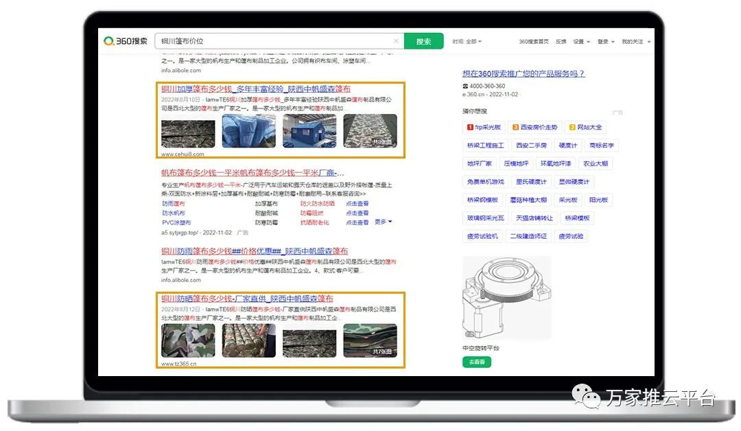 >>>B2B商盟:銅川篷布價位、榆林防曬篷布等關(guān)鍵詞均在360搜索引擎平臺首頁展現(xiàn)。